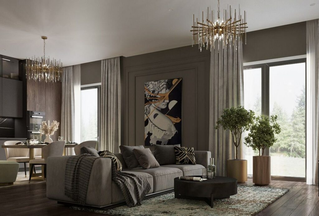 В доме выполнена полная отделка в современном стиле, который сочетает себе эстетику и функциональность. В основе дизайна продуманная цветовая палитра и насыщенные текстуры.